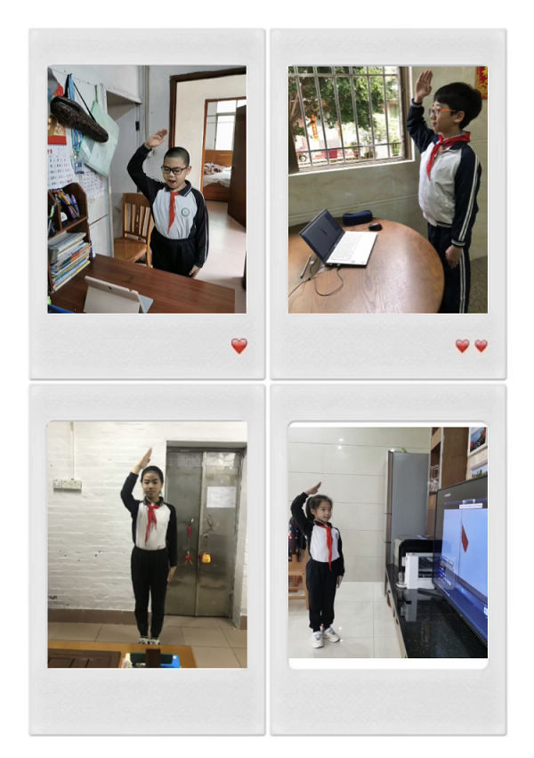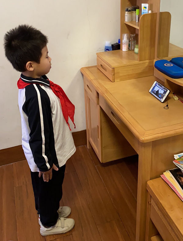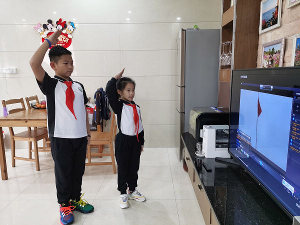伴随着雄浑激昂的国歌,鲜艳的五星红旗在罗沙校园冉冉升起。升旗台前,老师们衣着端庄,队列整齐;电脑、手机屏幕前,师生、家长们神情庄严肃穆,行礼,全体同时齐唱国歌。