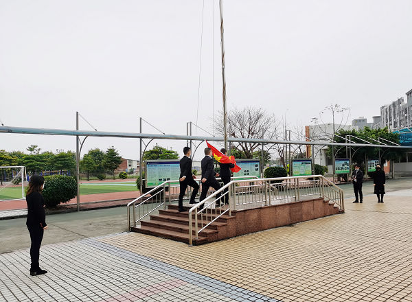 空旷的操场上,庄重如常。张永新校长和行政团队分别担任本次仪式的升旗手和护旗手,步伐整齐划一。