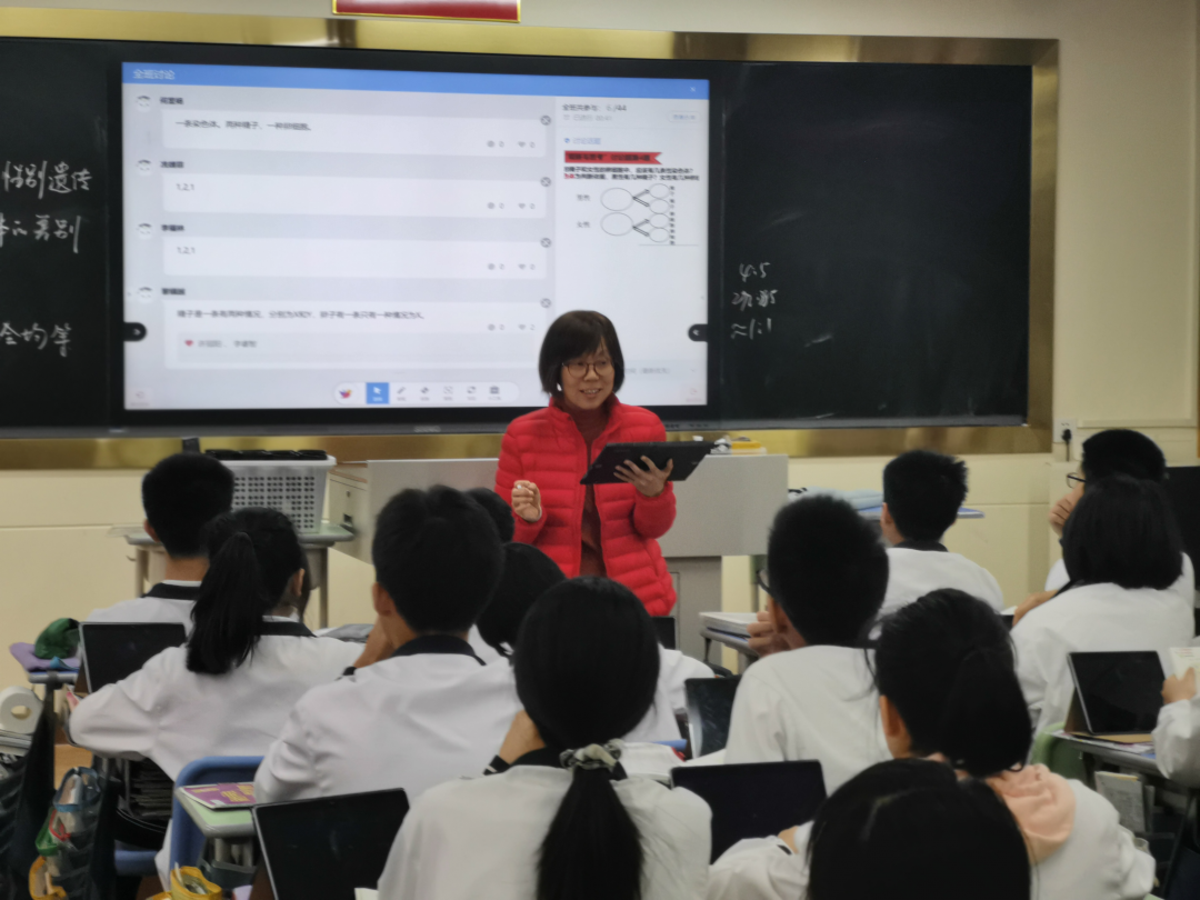 课前,林老师深入研究、挖掘教材,细心钻研智慧课堂新功能、新技术,并充分展现了备课组的智慧。林老师对课堂的教学环节进行了精心的设计,学生利用平板“抢答”、在“讨论框”进行学生思维的碰撞,利用黑白棋子进行“精子与卵子的随机结合”实验,将课堂气氛推向高潮,充分调动了学生积极性。最后更是将生物“初高知识点”完美衔接。林级熟练地使用信息技术展现了学生与“智慧课堂”的有机融合,给老师们示范了一节高效有序,逻辑缜密的深度课堂。