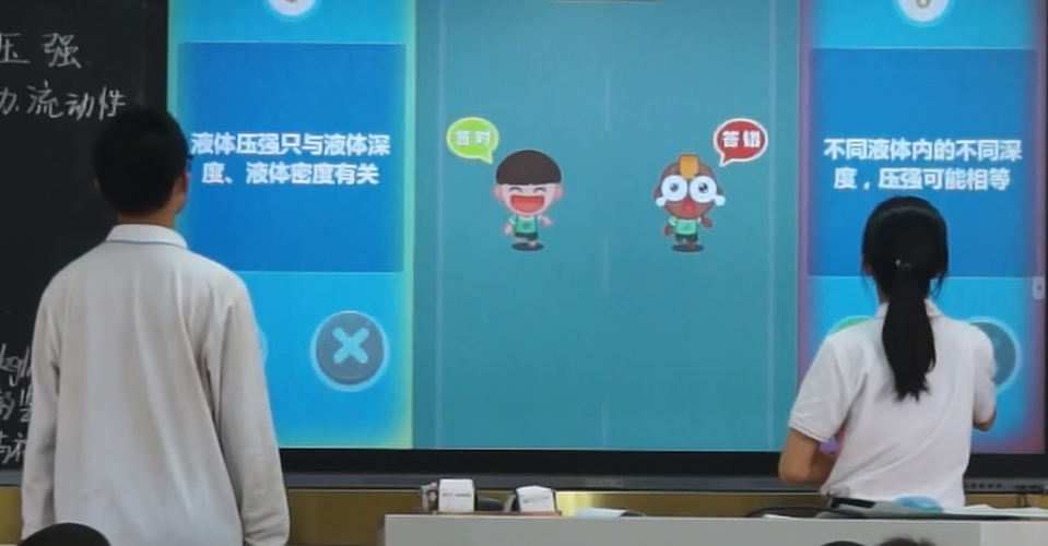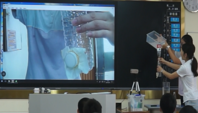 沈老师首先通过高清摄像头演示水对瓶底和瓶壁的橡皮膜作用情况,引入新课,瞬间激发了同学们的好奇心,引发学生思考液压产生的原因,从而想进一步探究液压的特点,液压的计算,为整堂课的顺利开展奠定了坚实的基础。