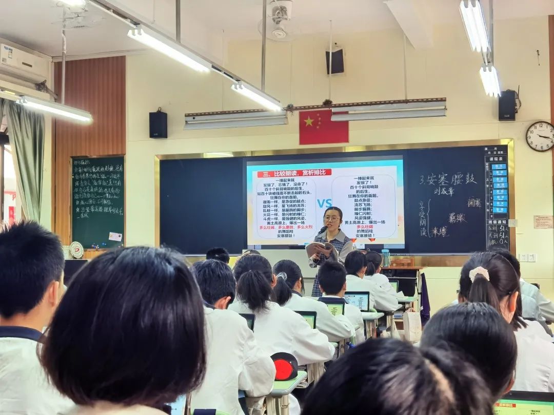 课前,孔老师充分发挥备课组的力量,集思广益,博采众长,进行了集体备课和磨课,做了充分准备。上课一开始,孔老师就运用形象直观的多媒体课件教学。雄健有力,充满激情的安塞腰鼓视频拉近了文本与学生之间的距离,激发了学生学习课文的欲望。孔老师接着引导学生体会课文里的“诗意和激情”,带领学生朗读课文,让学生在轻松的氛围下思考、交流、学习。学生领略了《安塞腰鼓》的魅力之后,孔老师又引导学生尝试仿写片段,激发学生的写作热情。整堂课课堂气氛活跃,学生的朗读水平明显提高,同时也培养了学生的思考、归纳、写作能力。