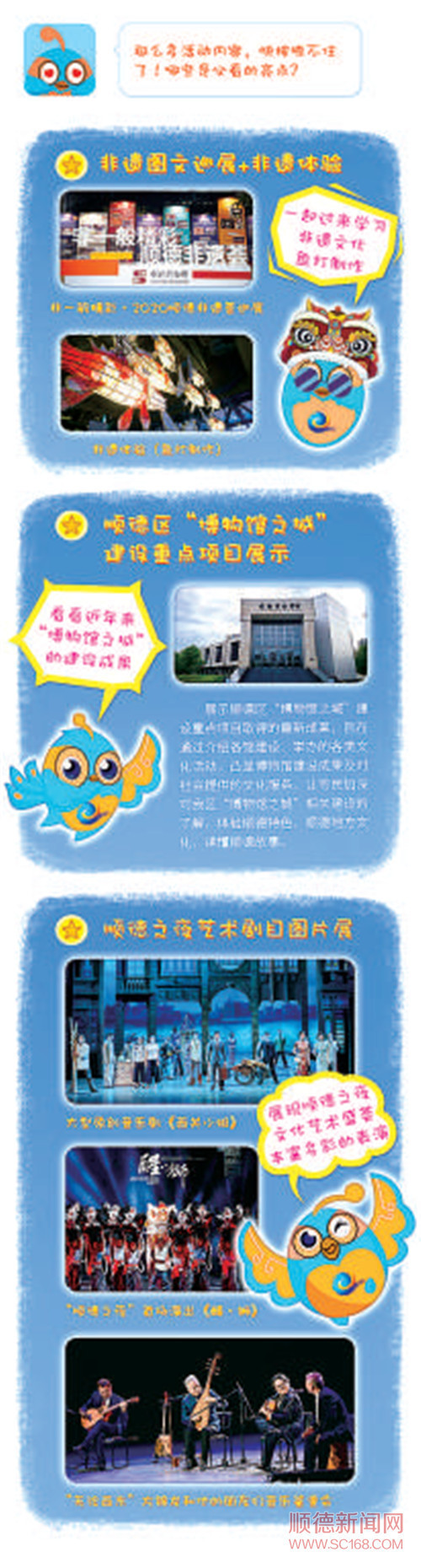 据介绍,创意阅读节展示区划分为三个区域:顺德区博物馆将举办非一般精彩·2020顺德非遗荟巡展、顺德区“博物馆之城”建设重点项目展示、非遗体验项目(做鱼灯);顺德区清晖园博物馆设置清晖园特色景观留影区,还将进行答题有礼环节;顺德区文化艺术发展中心举办街舞、手鼓、传统舞蹈表演,并展示2020年顺德之夜文化艺术盛荟剧目。晚上8点在展示区还将进行亮灯仪式,从博物馆的鱼灯区一直延伸到主舞台。