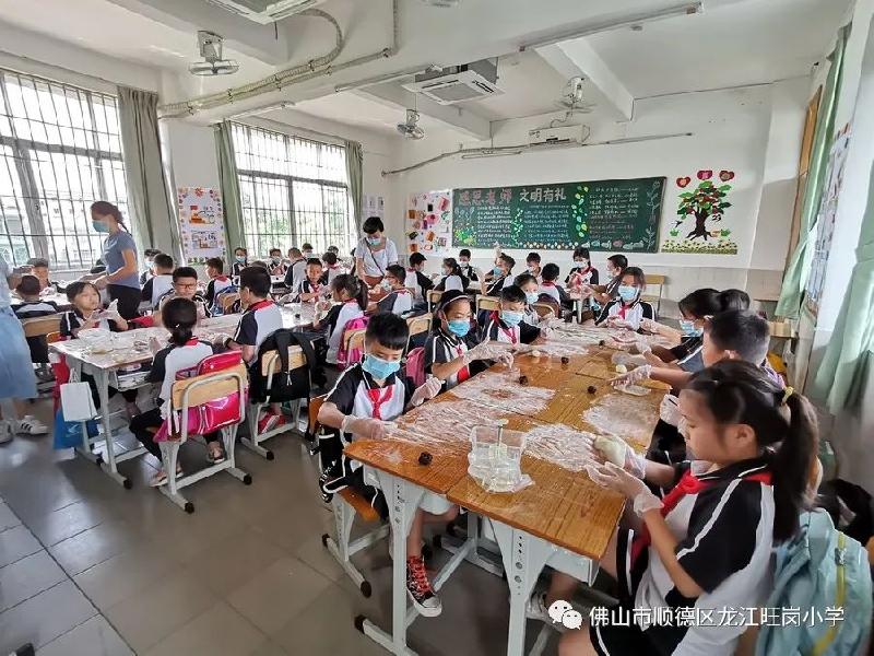 接下来,在几位家长的帮助下,同学们先做好了做月饼的准备――铺好桌面、按比例分好面皮和馅,个个都怀着激动的心情等待着做月饼。