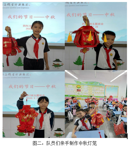 首先各班认真进行中秋节和国庆节的主题班会。辅导员们声情并茂地介绍中秋节的起源、风俗、相关的故事,从而有效加深了学生对我国传统节日的理解和认识,激发文化自信。队员们更通过制作中秋灯笼,进一步感受浓浓的中秋氛围。再而通过学习国庆节的演变历史、来历、意义和活动,更结合抗击疫情,感受祖国的巨大进步与繁荣昌盛,进一步激发了学生强烈的爱国热情与民族自豪感。