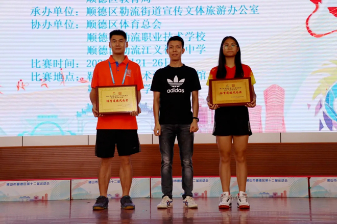 勒流街道代表队荣获“体育道德风尚奖”,江义中学排球队教练员伍剑华(左一)代表领奖