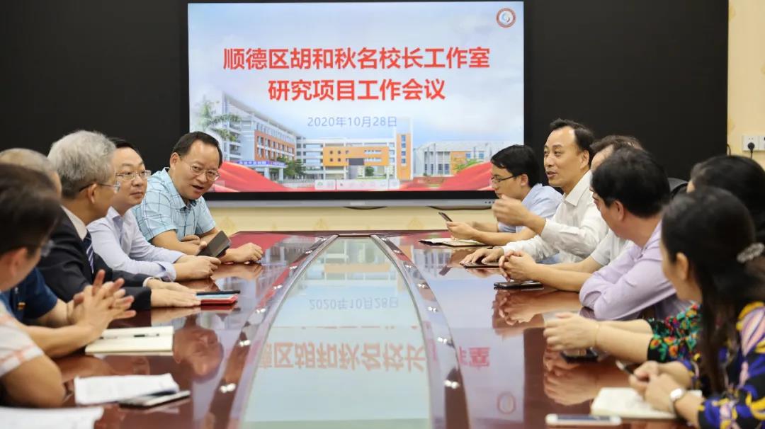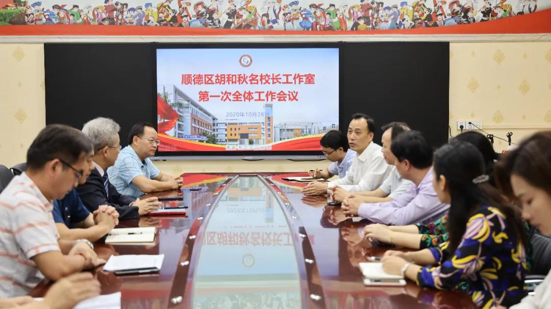 2020年10月28日下午,顺德区胡和秋名校长工作室成员齐聚江义中学开展第一次全体工作会议。会议特别邀请了顺德区教育发展中心教师发展研究室唐信焱主任、吴海坚副主任莅临指导。顺德区胡和秋名校长工作室首席主持人、江义中学校长胡和秋主持。