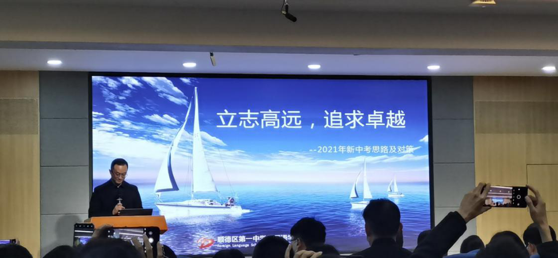 首先,由顺德区第一中学外国语学校曾祥明校长作《立志高远 追求卓越――2021年新中考备考思路及对策》主题演讲,他简明扼要讲述新中考的新特点及该校的应对策略;接着,由华南师范大学王世伟教授作《广东省新中考政策解读及应对》主题演讲,王教授利用具体的中考题作了深入浅出的关于新中考新特点的解读。