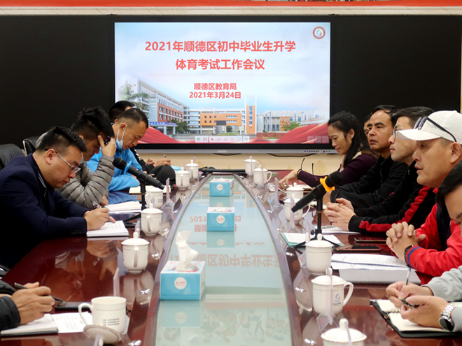 3月24日,顺德区初中毕业生升学体育考试工作会议在我校召开,顺德区教育局负责体育招生工作的李伟和刘罡两位老师,以及区属初中体育负责人、全区各镇街教育办体育专干参加了本次会议。会议对2021年顺德区体育中考工作作了部署。