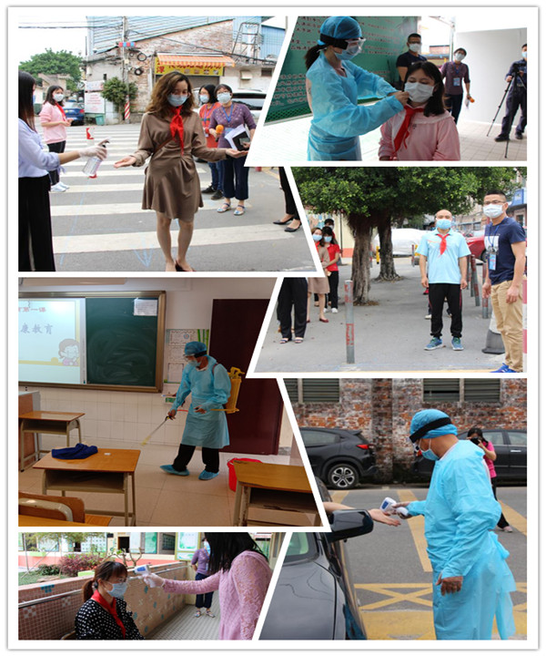 第一个演练场景是学校大门。为了筑起校园疫情防控的第一道防线,学校大门按严格要求围蔽,修缮了消毒通道。早晨,戴好防护口罩和手套的值日教师、保安人员提前到岗。首先,值日教师指挥各年级同学按照有一定间隔距离排队、维持秩序。接着,值日教师在消毒通道前,提醒学生佩戴好口罩,用消毒药水为学生消毒,并井然有序地进校门,然后进行体温测量。当发现一位学生体温异常,穿戴好防护服和口罩、护目镜的检测员立即关闭入校通道,将疑似高温学生带入校门口旁的健康观察室,进行水银体温计量度体温复测,发现再次异常,立即通知卫生部门何凤施主任和班主任到场。同时,由保健老师杨老师检查、安抚、询问异常学生,了解有无任何疫区接触史和外出史等基本情况,检测体温,并做好登记;班主任及时致电家长复核确认学生是否有流行病学史,并通知家长接学生去看病,发现体温复测仍然偏高,班主任向分管行政何凤施主任汇报情况,立即启动应急处理程序,逐级上报。待该学生离开健康观察室后,由何老师带后勤人员负责消毒。病患学生离校后,由卫生健康副校长指导下开展后续工作。