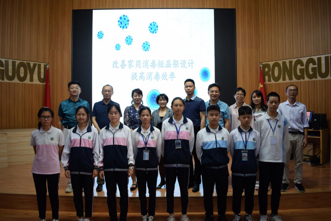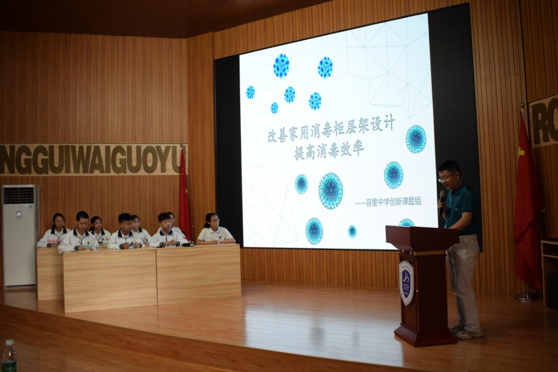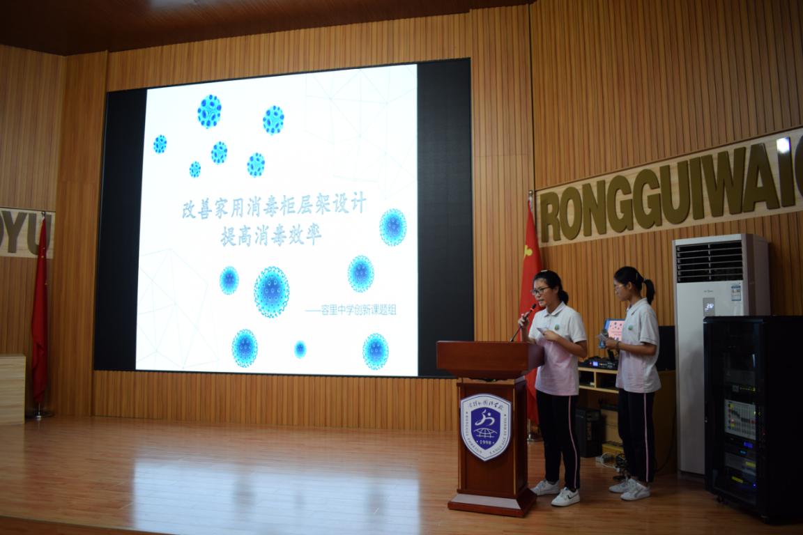 来自容里中学的谭雨萱等代表正在作《改善家用消毒柜层架设计,提高消毒效率》的开题报告。