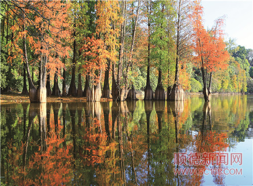 水杉在水面映衬下别有一番景致。