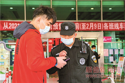 顺德客运总站安保人员在售票厅前查看市民的健康码。/珠江商报记者朱德文摄