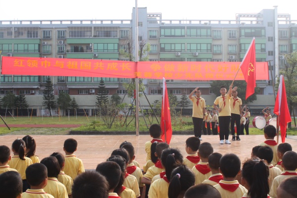 在充满朝气和活力的中国少年先锋队队歌的歌声中,仪式拉开了帷幕。首先是庄严而肃穆的升国旗仪式。接下里,学校领导翟军校长讲话,他表达了对少先队员们的殷切希望,鼓励队员们努力学习时刻做好准备,争做共产主义事业的接班人。大队辅导员廖少红老师带领全体队员学习了习总书记在会见中国少年先锋队第七次全国代表大会代表时的讲话精神,使全体队员充分认识到了童年是人的一生中最宝贵的时期,在这个时期要注意树立正确的人生目标,培养好思想、好品行、好习惯,做祖国的好儿童,做祖国的建设者。