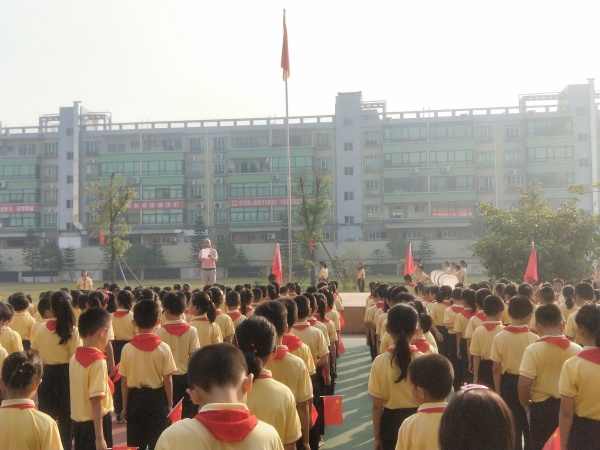 接下来,由学校少先队辅导员廖少红老师指挥,全校师生迎着朝阳,用满怀的激情、嘹亮的歌声唱响了《爱我中华》、《歌唱祖国》,歌声响彻校园上空,表达着全体师生对伟大祖国的热爱与赞美。全校师生唱完后齐声高呼:祖国万岁!