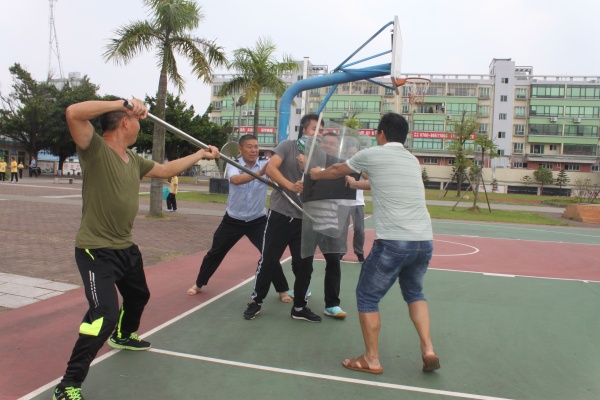 为了做好这次演练,学校安全组制定了防暴力袭击应急演练方案。主管安全的学校行政杨振宇主任给学校安保人员及男教师进行校园安全应急培训会。会后,部分男教师及学校安保人员扮演不同角色模拟演练。演练流程是:一名老师扮演歹徒,以到教室找班主任了解学生学习情况的名义骗过保安人员进入了校园,突然拔刀冲入,保安人员发现,立即出动,和学校老师手持防爆叉等工具将恐怖分子团团围住,巧妙周旋,赢得援助时间。并想方设法将歹徒制服。