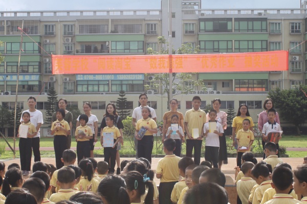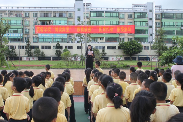 淘宝活动结束后,主持人宣读阅读考级通过的名单,芙蓉学校的操场上掌声雷动,同学们兴高采烈地走上领奖席领取阅读考级证书,杨艳丽老师为本学期参加考级并顺利通过考核的同学颁发证书。现场气氛十分活跃,全校师生以热烈的掌声对这些认真读书的同学表示嘉许和鼓励。