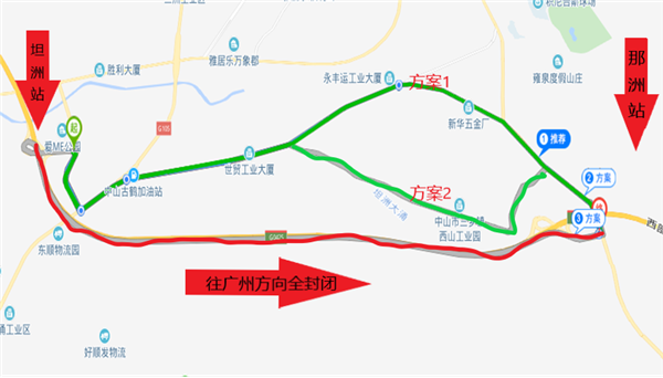 绕行路线:江门往中山、广州方向车辆,从坦洲收费站出→右转进入广珠大道→导航进入那洲收费站。