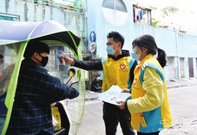 志愿者给进入小区的人测体温。