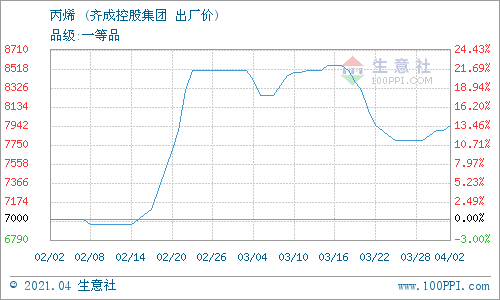 4月2日,齐成控股集团丙烯最新报价上调,涨50元/吨至7950元/吨。