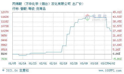 4月2日,万华化学石化丙烯酸(华东)最新报价在10300元/吨,较上一交易日相比持平,实际成交价以协商为主。