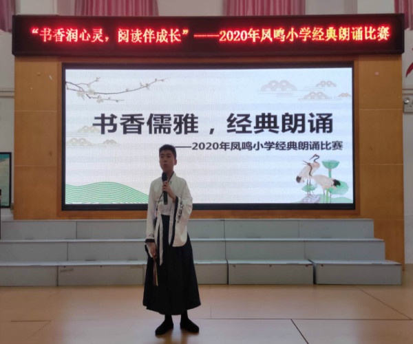 2020年9月11日,凤鸣小学在修身学堂举行经典朗诵比赛。参加本次活动的选手来自中、高年级。比赛现场,同学们的表现可圈可点。在题材方面,有《生命》、《校园早晨》、《祖国啊,我亲爱的祖国》、《再别康桥》、《水调歌头》、《可爱的中国》等等,既有现代诗歌,又有古典诗歌,文质兼美。在情感表现方面,选手们都经过认真准备,感情真挚,他们或歌唱祖国,或吟咏理想,现场高潮迭起,六(1)班潘英泽同学朗诵苏轼《水调歌头》,如痴如狂的样子使观众深受感染;五(3)班徐晟桐同学朗诵梁启超《祖国啊,我亲爱的祖国》,全情投入,慷概激昂,豪情万丈,获得现场观众阵阵掌声。选手们时而沉郁顿挫,时而低头浅吟,他们凭借内容丰富、表现力强、形式创新征服了现场评委和观众。