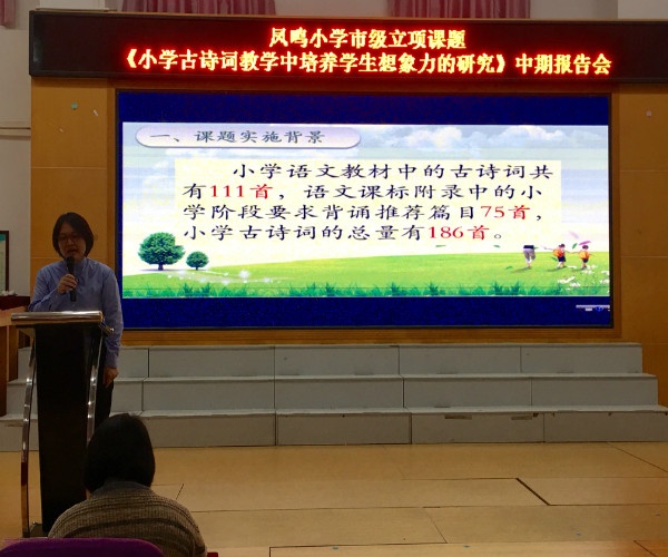 课题组成员黄晓燕老师进行了《元日》古诗课例展示,凤鸣小学学生带来了精彩的古诗系列表演《游子吟》及《望月》。接着,课题主持人刘苑老师作了课题中期报告。在报告中,刘苑老师从教材、语文课程标准、学校教学现状等方面介绍了课题的实施背景。接着,刘老师重点介绍了课题的运行情况,前期在学校的支持和专家的指导下,课题取得了阶段性成果:教师在古诗词方面的教研能力得到了提升,在学生古诗词想象力培养方面也取得了一定成效,但仍存在研究深度和广度不够、课外延伸性活动不多、评价方式不及时等问题。