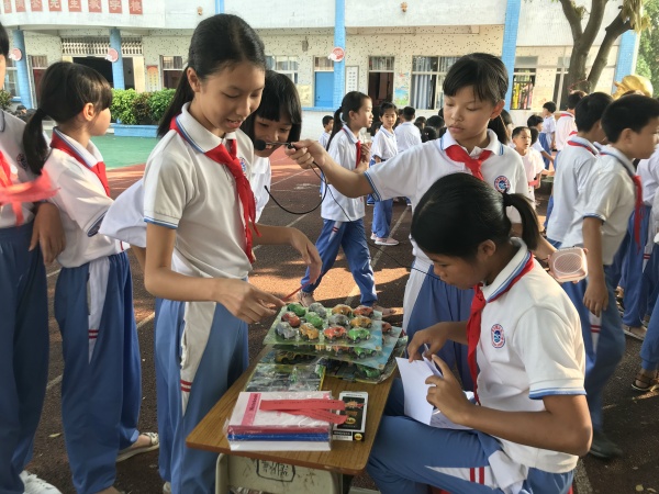 听,凤凰树下的小舞台上,一曲动听的《万众一心跟党走》吸引了不少围观的同学们。咸水歌表演的同学们娓娓动听的歌声赢得了观众们的阵阵掌声。讲革命故事的同学们准备充 分,《王二小》、《董存瑞舍身炸暗堡》……一个个伟大革命先烈的形象深入同学们的心中。看,手工制作、书法绘画展示的同学们也不甘示弱,一个个精美的手工作品、一幅幅惟妙惟肖的画在同学们的手下诞生。人气最旺的要数猜谜语活动了,同学们有的三三两两聚在一起,绞尽脑汁地想着答案;有的时不时交头接耳,想从同伴的身上找到灵感;有的已经猜出谜底了,正排着长长的队伍准备兑换奖品。校园上空回荡着同学们的欢声笑语,好一片欢乐祥和的景象!
