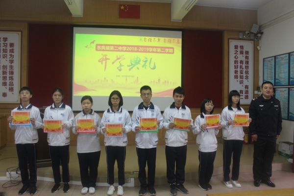 开学典礼的最后一项,是进行颁奖典礼。表彰在2018-2019学年第一学期期末考试中取得优异成绩的同学们。胡松华校长、欧发贵副校长、胡发良副校长、法制副校长东凤镇公安分局唐小飞大队长,家委会代表家委会会长黄树辉先生分别为获得学习标兵、学习优秀、单科状元的学生颁发证书。