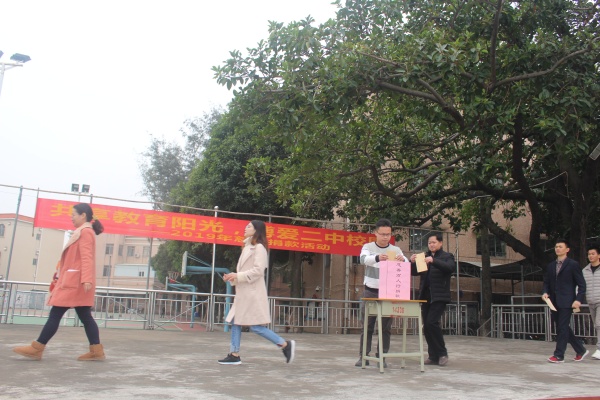 本次慈善捐款活动由德育处主持策划、团委负责具体的执行。活动第一项,由学校胡发良副校长宣读捐款倡议,号召同学们、家长朋友们以共享教育阳光为目的,为东凤教育事业做出自己的贡献。胡发良校长强调:再穷不能穷教育,教育事业的发展,离不开社会各界人士的关心与支持,本次所筹善款主要用于东凤镇中心小学教学楼扩建工程和东凤镇奖教、助教和助学等教育项目,同时也能解决公办学位不足问题,让外地务工子女共享教育阳光,进一步提升教育教学质量,希望同学们踊跃支持。活动第二项是教职工进行慈善捐款,活动第三项是各班班长收集好各班的捐款后进行捐款。本次慈善捐款活动,得到了广大师生支持,经过团委的统计,本次慈善活动共筹集善款14720.8元。