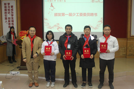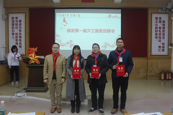 在闭幕式上,东凤镇少工委总辅导员赖老师为新当选的学校少工委主任、副主任、总辅导员以及委员们颁发了聘书。随后,新当选的委员们与赖总辅导员一起为学校少工委的成立进行了简单而隆重的揭牌仪式。这也意味着学校少工委正式成立了,这是学校少先队工作的重要里程碑。