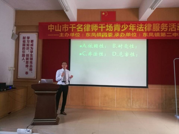 2018年12月3日下午,东凤镇团委与东凤二中一同举办了“千名律师千场青少年法律服务活动”。本次活动有幸请到了中山市凯行律师事务所梁友明律师为同学开设禁毒讲座,讲座的主题是“远离毒品,珍爱生命”,讲座由胡发良副校长主持。