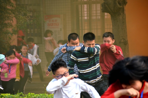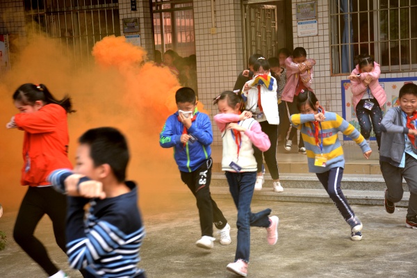 当天下午,科教楼的学生们正在上课,突然浓烟四起,瞬间,整座教学楼笼罩在烟雾中。随着清脆响亮的火警铃声响起,东海学校消防演练正式开始。学校各楼层负责老师迅速冲到楼层指定地点,协助各班指挥学生疏散。学生们听到报警信号后,迅速捂住鼻子,在老师们的指挥下有序地按照预定线路从楼梯撤走。各个楼层的重要路口分别有老师负责帮扶并搜索楼层角落有无遗漏的学生。当全校学生安全撤离到校园操场的空旷地方后,各班老师马上清点人数及时向总指挥报告。整个过程严格按照预案进行,做到了组织严密、撤离有序。所有的学生都安全有序地顺利到达指定安全区域。