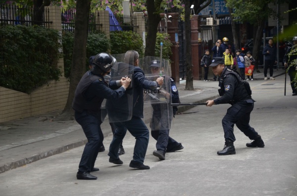 肖凯赞主任接到警报后第一时间组织防暴应急小组前往出事现场。所有防暴组成员持器械迅速到达教学楼楼下,分工据守对应楼道,阻止“暴恐分子”进入教学楼。应急指挥小组也调动各方力量,集中力量到“暴恐分子”突击的入口,尽量拖延时间,等待警察的到来。