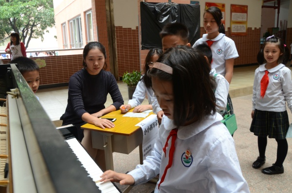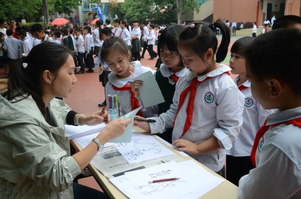 本次艺术节开幕式不同于以往观看表演节目的传统方式,而是改成了全体学生都可以参与进来的校园艺术游园活动。这次活动共有30个不同内容的艺术游戏摊位,每个摊位的活动形式都是艺术科组老师们精心策划准备的,比如“盲人击鼓”、“吹出来的怪物”、“Do大哥漂流记”、“水写字”等等各种游戏,涵盖了美术、音乐、书法、心理各艺术科目。学生们兴高采烈地参与其中,有的在摊位前聚精会神地描画着心中的美好画面,有的手里拿着小剪刀秀一秀自己的纸艺特长,有的在节奏游戏摊位上自信大声地拍打着节奏,有的看着字母谱卡片肯定的唱出一个个灵动的小音符……看着自己手中的雏鹰章个数呈几何数增加,每个同学的脸上都洋溢起了幸福的笑容。活动历经一个小时结束,同学们揣着收获满满的争章纸,排着整齐的队伍回到课室,在班主任老师那里领到了自己心仪的奖品。