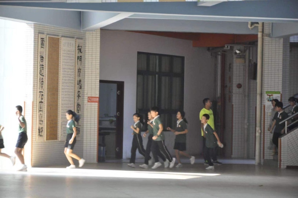 下午三点四十分,警报拉响,演练开始。各班学生迅速有序出班,按照各自逃生路线向安全区域疏散。每个班级的班主任及副班主任的带领下,有序行动,各楼梯及小道上也有安全员从旁指挥引导。学生听从指挥,行动迅速。