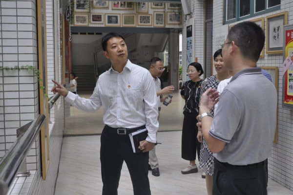 黄宇健副书记一行首先到教师办公室看望慰问教师,与他们亲切交谈,了解他们的教学、生活情况。黄宇健副书记对轩小教师们的积极的工作状态和饱满的精神状态给予了极大的赞赏。接着,黄宇健副书记一行深入到课室,观察孩子们的学习情况,并对学校各班级的班级文化布置表示肯定。走访中,黄宇健副书记详细询问了开学初学生的出勤、健康状况,老师的就位情况与学校开学工作的情况,同时细心询问了学校所面临的困难。林华志校长表示,学校的功能场室相对紧缺,希望能够得到解决。黄宇健副书记一行又到学校的功能场室进行走访,了解详情。区领导对轩小校园环境及开学的各项工作有条不紊表示了肯定,对充满艺术气息的书法室、书法长廊和轩小的艺术教育表示了极大的赞赏。