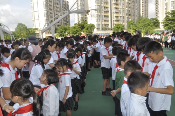 接着,由五年级的老队员为新队员佩戴上了红领巾,寓意着少先队优良传统的传承。在少工委总辅导员杨紫絃主任的带领下,新队员们进行了庄严的宣誓。各中队辅导员逐一上台接受少工委副主任曾文珍校长所授予的中队旗,标志着十个新中队的正式建立!在年级大队建队仪式中,学校的资深志愿者,年长的洪爷爷为新成立的各中队的亲子义工队长颁发了聘书。最后,庄严的仪式在全体少先队员自豪的呼号声中落下帷幕。