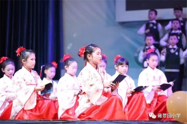 “时间到,雍景园小学三年级庆元旦文艺汇演正式开始!”上午9点整,随着主持人的一声令下,三1班全体同学表演的大合唱《新年好》第一个闪亮登场,拉开了本次元旦汇演的序幕,热情奔放的歌声立刻感染了全场的每个学生;接下来,三2班全体同学表演的舞蹈加朗诵《剪窗花》,道具逼真,表演到位,声情俱茂,赢得了全场的阵阵喝彩;三6班男同学表演的男子舞蹈《快乐篮球》,娴熟的动作整齐划一,阳刚之美热情四溢。三5班尹杭等同学带来的T台走秀《五彩缤纷炫童年》,用孩子的形体和视角去演绎自己的精彩。《三字经》是中华民族珍贵的文化遗产,它短小精悍,琅琅上口,千百年来,家喻户晓。其内容涵盖了历史、天文、地理、道德以及一些民间传说,所谓“熟读《三字经》,可知千古事”。三6班全体同学合唱《三字经》,将演出推向了高潮。