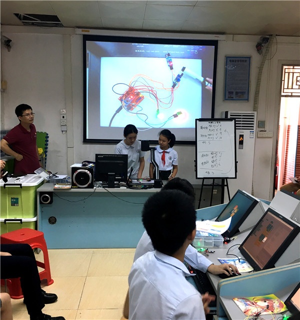 课下,执教老师先对自己的课做了简单说课,在座的老师对每节课纷纷发表了自己的看法。最后,市教研员陈明宏老师指出创客教育在小学信息技术课上如何实现,关键在于要先选择好一个要解决的实际问题,难点在于如何基于这个问题来建立模型,重点在于这个模型下的程序如何具体实现,亮点在于学生创作的作品展示与分享。