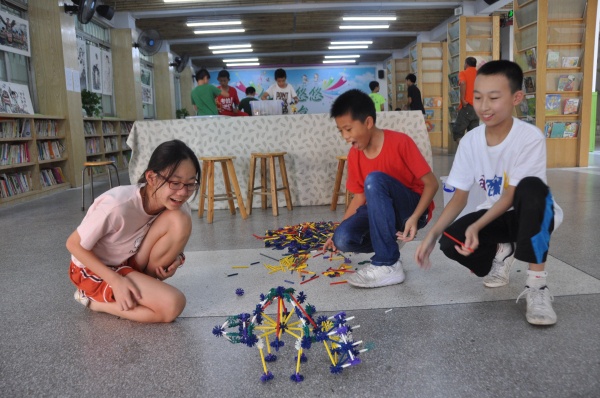 参赛同学都全神贯注地投入比赛。瞧,这是机器人现场拼装赛的同学,他们三人为一组,在那么多五颜六色的零件中挑选出自己所需材料,现场构建一个模型,多认真啊!这是科学幻想绘画赛的同学,他们一会儿沉思,一会儿挥笔描边、涂色,多专注啊!3D涂鸦笔绘画好特别呀!台面一排插座,电线连接下的笔会喷出绘画所需材料,然后绘成一幅幅画,有些画还是立体的哦!