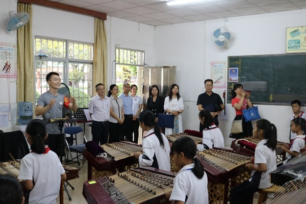 此时正是学校快乐吹奏的时光,音乐响起,师生快速集结操场,师生千人巴乌吹奏《小星星》《小螺号》等曲目,欢快的旋律在操场上空飘荡,场面壮观。班级展示的民乐串烧别具一格,同学们指法娴熟,节拍准确,曲目的处理及编排彰显了起湾学校的“和乐”德育品牌。领导们一边观看,一边频频点头,对学校的特色发展给了充分的肯定。新海民乐社团的汇报演出更是博得了大家的掌声,古筝、扬琴、二胡、竹笛等多个声部合奏的《权御天下》旋律优美,震撼人心。