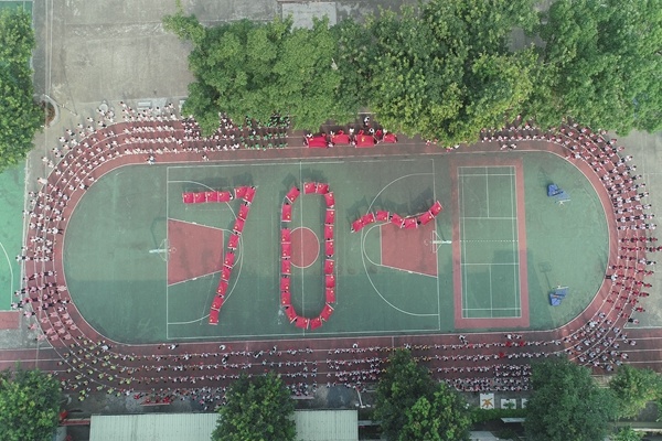 精彩的快闪活动达到了高潮,国旗方队迅速变换队形,队员们双手托着鲜艳的国旗,在操场中央变换出大大的“70”字样,来庆祝新中国成立70周年,旗面飘动,鲜艳的“70”字样在蓝天白云、绿荫的映衬下是那么耀眼。同时吕晓宁老师吹起了竹笛,张嘉怡老师弹奏起古筝,与民乐团学生一起合奏《今天是你的生日》,各班师生一起高唱“……星空体育祝福你的生日我的中国,愿你逆风起飞雨中获得收获,星空体育祝福你的生日我的中国,这是儿女们心中希望的歌,这是儿女们心中希望的歌……”这祝福的歌声萦绕在学校的每个角落,感动着全校师生。