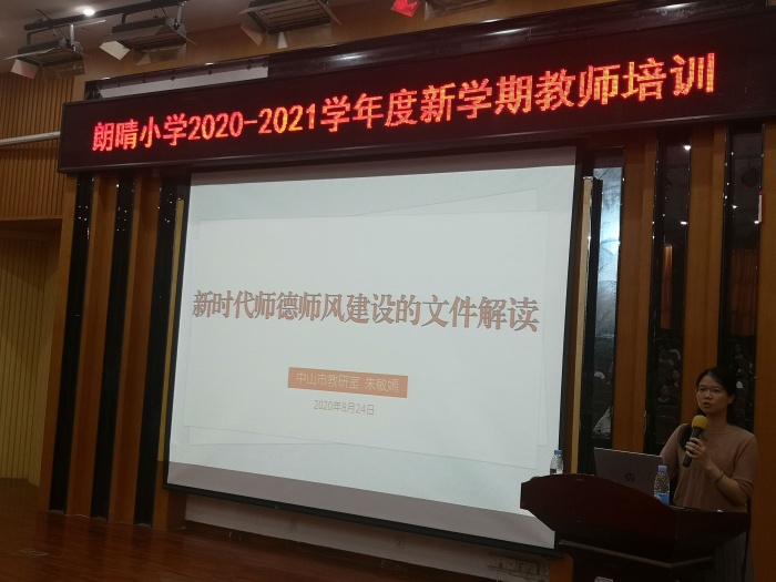 8月28日是培训第一天,刘珺主任首先向全体教师致以新学期的问候。接着,特邀中山市教研室办公室朱敏嫣主任开展《新时代师德师风建设的文件解读》讲座。朱主任通过案例、视频和热点话题,深入解读新时代师德师风建设的相关文件。全体教师深受教育和启发,立志争做新时代“四有”好老师。