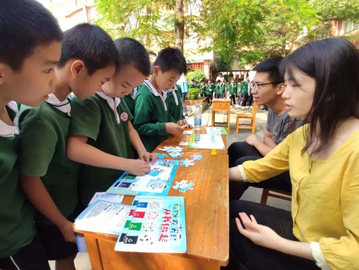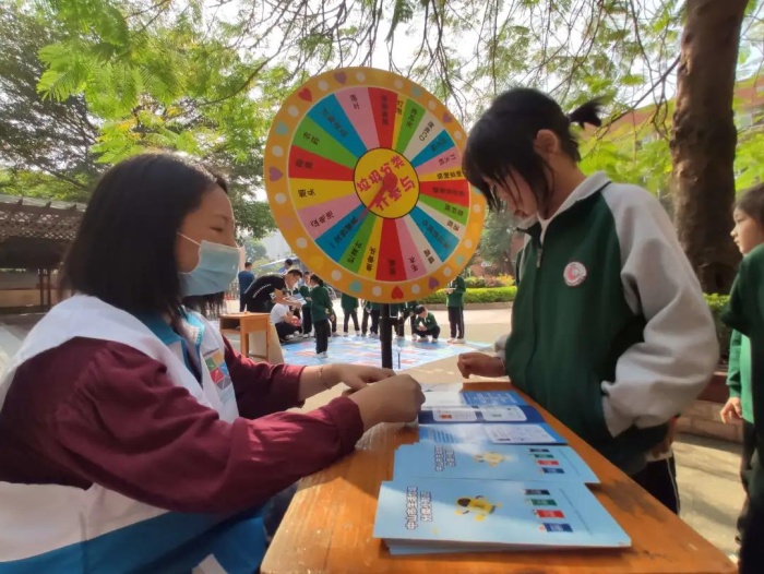 志愿者们以一个个垃圾分类实例作导引,向同学们讲解垃圾分类的相关知识,并分发垃圾分类宣传手册。实践验真知,蕴含垃圾分类知识的趣味游戏将活动推向高潮。现场不仅有益智的“垃圾分类大转盘”“垃圾分类模拟投放”“垃圾分类有奖问答”,还有动脑又动手的“垃圾分类拼图游戏”和“垃圾分类跳飞机”“垃圾分类投篮”,各种趣味小游戏吸引了同学们的热情参与,现场气氛热烈,同学们在游戏互动中不断巩固垃圾分类知识。在“垃圾分类有奖问答”游戏环节,同学们聚精会神,根据志愿者的口令或问题,准确回答垃圾分类的问题,不仅考验了大家对垃圾分类的了解,也锻炼了反应能力,小朋友们玩得不亦乐乎。