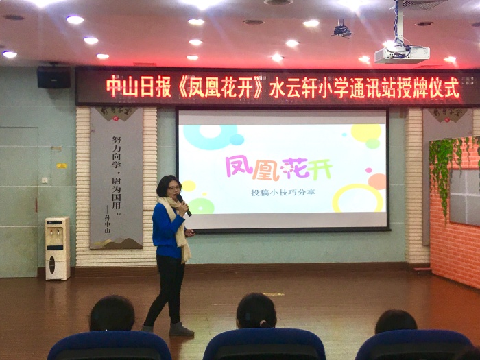 为推动校园精神文明建设,响应广东省中小学创建“书香校园”活动的号召,丰富学生的校园文化生活,12月17日下午,中山日报《凤凰花开》校园专刊东区水云轩小学通讯站挂牌仪式在多媒体教室举行。《凤凰花开》校园专刊主编黄汉英为文学社的同学们带来“《凤凰花开》投稿技巧知多少”的主题讲座。中山报业传媒股份有限公司教育工作室总监罗展新、《凤凰花开》校园专刊栏目主编黄汉英、广东人民出版社中山出版有限公司刘婷婷编辑、校长林小舟、教务处副主任徐雪华出席了本次活动,校文学社全体社员到场聆听。