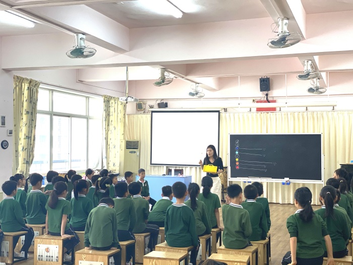 水云轩小学的袁颖诗老师通过对《彝家娃娃真幸福》歌曲旋律的分析,使学生熟歌变本领,复习巩固了mi-sol-la在五线谱上音高位置以及音准要求,师生合作演唱完整的曲谱,并结合歌曲内容进行了互动性的律动环节。