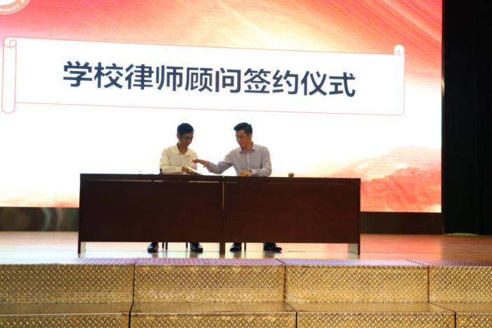 为了让学校的法制工作开展得更加顺畅,学校聘请东区起湾派出所警员李木生为学校法制辅导员,聘请东区起湾派出所副所长罗勇彬为学校法制副校长,林校长为他们颁发了聘书。同时,学校还聘请了广东凯行律师事务所朱志强律师为学校专业的律师顾问,并进行了签约。