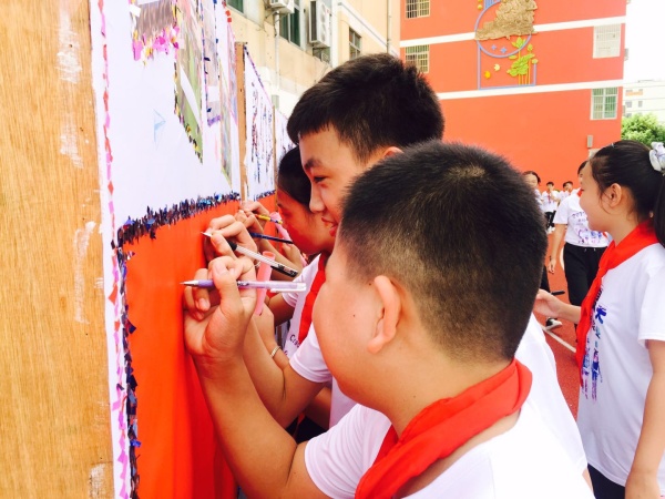 演出结束后,每位学生在毕业寄语墙上写下了自己对学校想说的话,送给母校最后一份祝福,写完之后走过“梦想之门”,与母校挥别,与这六年的小学生活挥别,憧憬即将到来的中学生活。