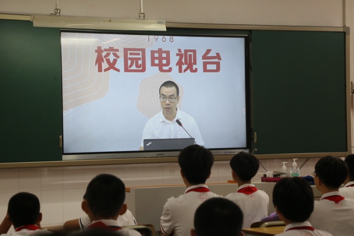 下午突降大雨,按照预案,全体师生留在教室。学校利用校园电视台,举行了简洁明快的开学礼。开学礼必不可少的仪式——展国旗高唱国歌顺利进行。在雄壮的国歌声伴奏下,师生们注目大屏幕上的国旗,一起唱响了国歌。通过电视屏幕,同学们一一认识了学校行政团队成员。