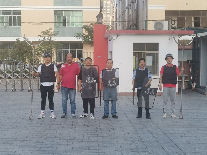 8:30,演习开始:门口有不明人员企图混进校园,保安阻止无效,危险升级,歹徒手持菜刀,恐吓要挟闯进校园,一名保安马上拿起盾牌、警棍格挡,另一名老师手持钢叉牵制,并迅速按响“一键警鸣”,两名保安合力把歹徒逼到校园无人一带,牵制歹徒,保安与老师合力把歹徒制服,危险解除,演练完毕。